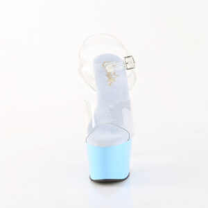 High-Heel Sandalette in schwarz Lack mit breitem Fesselriemchen und grosser silberfarbener Schnalle als Verschluss von Pleaser USA.