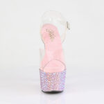 Plateau und Absatz sind mit unterschiedlich großen baby pinken Strass-Steinen besetzt.