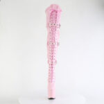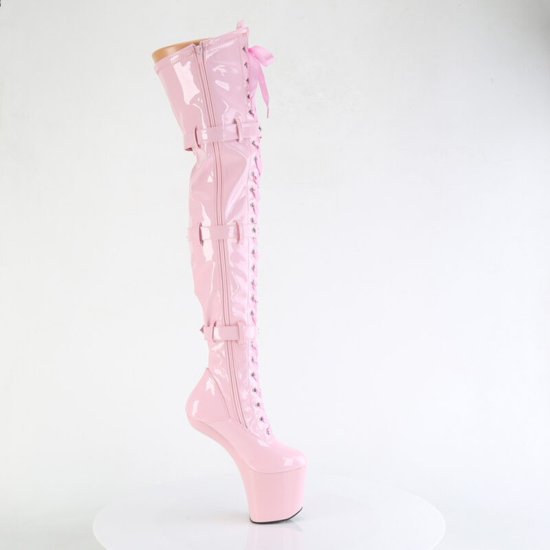 Heelless Overknee Plateau Stiefel aus baby pinkem Stretchlack mit Schnürung und Schnallen von Pleaser USA.