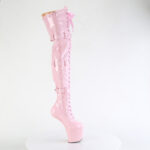 Absatzlose Heelless Plateau Overknee Stiefel CRAZE-3028 aus baby pinkem Stretchlack mit Schnürung und Schnallen, an der Ferse 20 cm hoch und 7,6 cm Plateau.