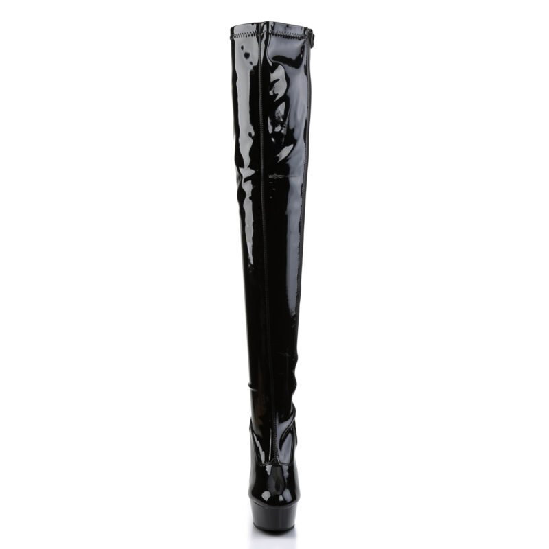 Overknee Stiefel mit Plateau in schwarzem Stretchlack von Pleaser USA.