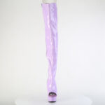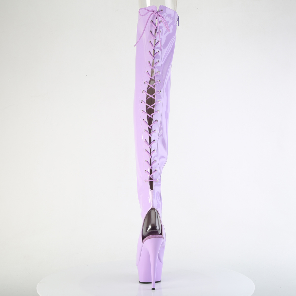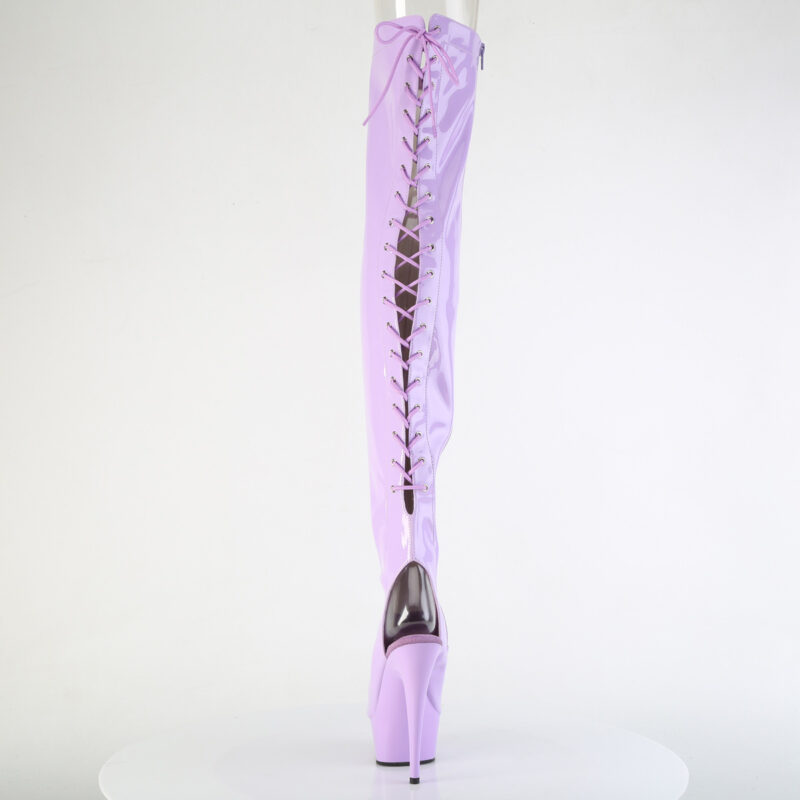 Lavendelfarbiger High Heel Overknee Stretchlackstiefel mit Schnürung hinten der Marke Pleaser.