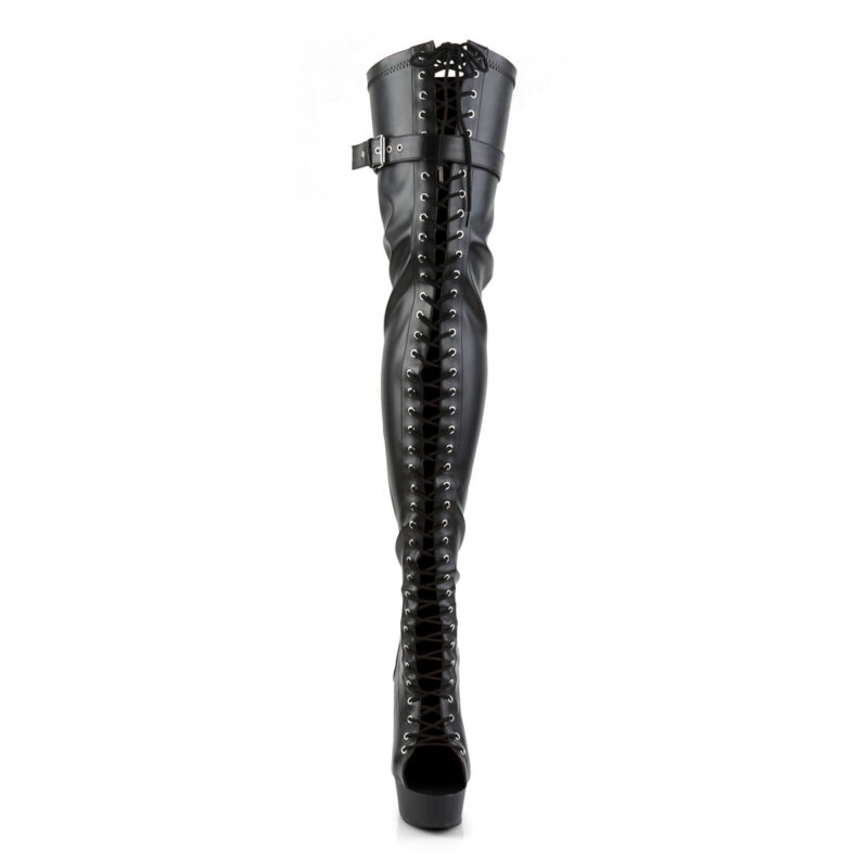 DELIGHT-3025ML Peep Toe Overknee Stiefel mit Schnürung in schwarz Stretch-PU und Spitze