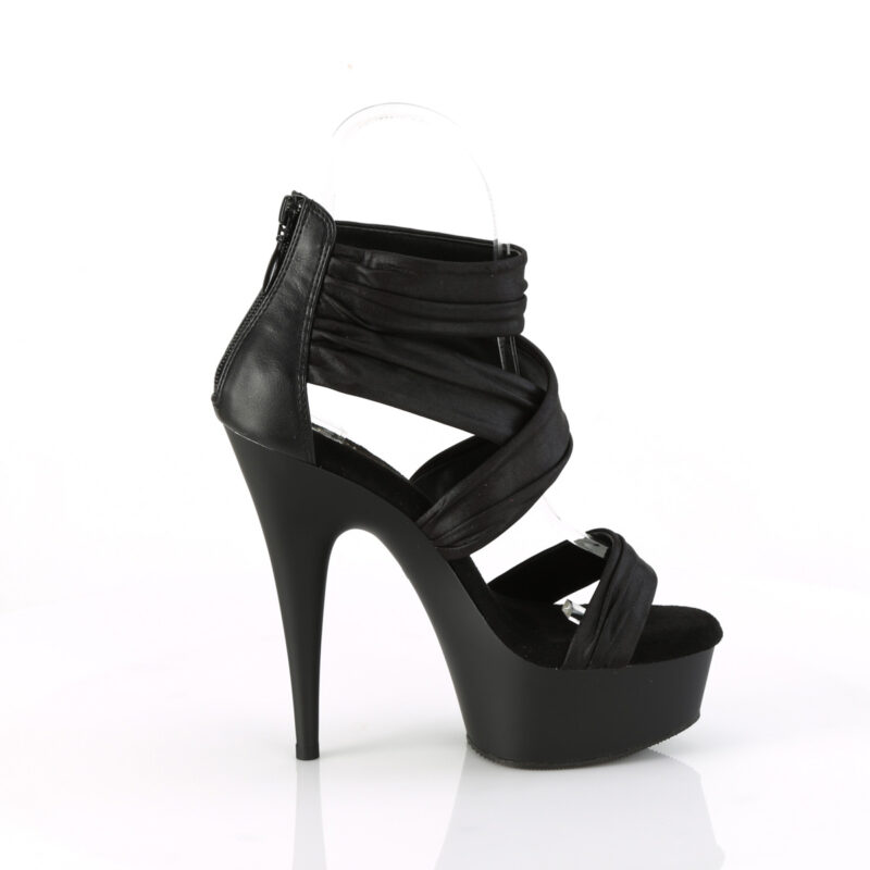 High Heel Plateau Sandalette mit breiten gerafften Knöchelriemchen in schwarzer Lederoptik von Pleaser USA.