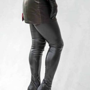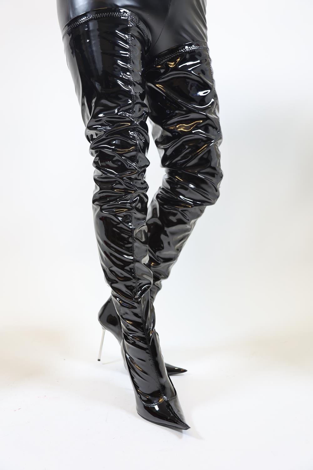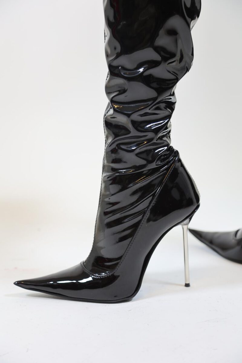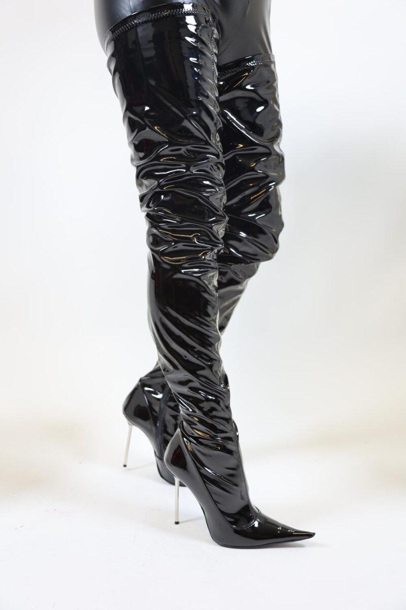 Extralanger schwarzer Overknee Lackstiefel mit silbernem Metallabsatz.