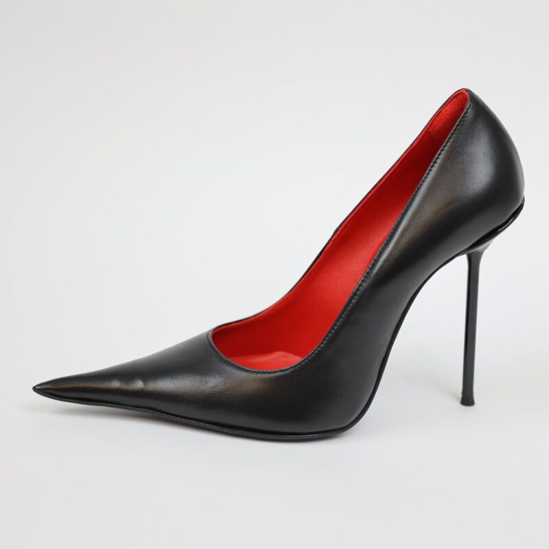 Spitzer italienischer Longpoint Designer-Pumps, gefertigt aus hochwertigem Leder, mit einem feinen, dünnen High-Heel Metallabsatz, rotes Lederfutter und roter Lederinnensohle.
